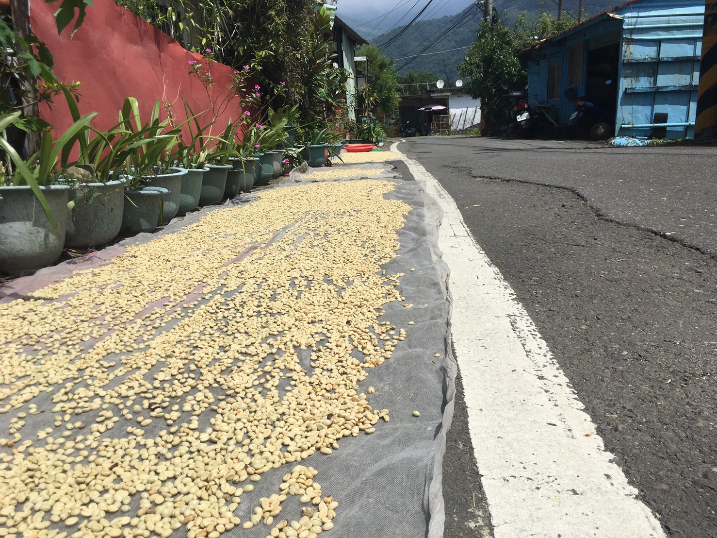 咖啡豆用日曬的處理方式,運用祖先流傳下來的古老智慧,直接在柏油路上曝曬生豆,不只利用太陽的輻射也間接利用柏油的熱度. 由於部落人車稀少才得以用最天然無污染自然的方式去烘曬豆子.